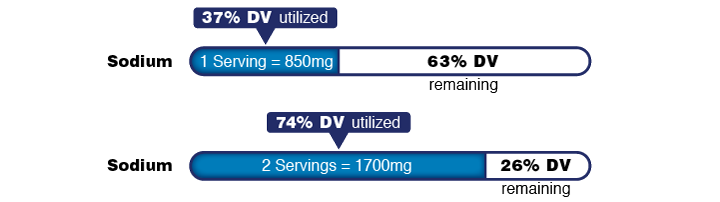 예 : 샘플 영양 라벨에 표시된 1인분의 나트륨 양을 보십시오. 37%의 %DV가 식단에 많이 기여합니까 아니면 적게 기여합니까? %DV에 대한 일반 가이드를 확인하십시오 . 이 제품은 37% DV의 나트륨을 함유하고 있으며 이는 이것이 HIGH 나트륨 제품임을 나타냅니다(나트륨 DV가 20% 이상임). 2인분을 섭취하면 나트륨 DV의 74%, 즉 하루 전체 나트륨 섭취량의 거의 3/4을 제공하게 됩니다.